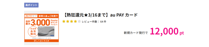 au PAY カードはポイントサイトで常時、キャンペーンをやっているので高額ポイントをゲットするチャンスがあります。