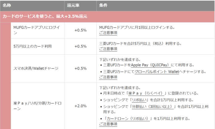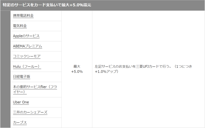 三菱UFJカードは、対象の飲食店やコンビニ、スーパーで支払いをしたときに還元率がアップします。
