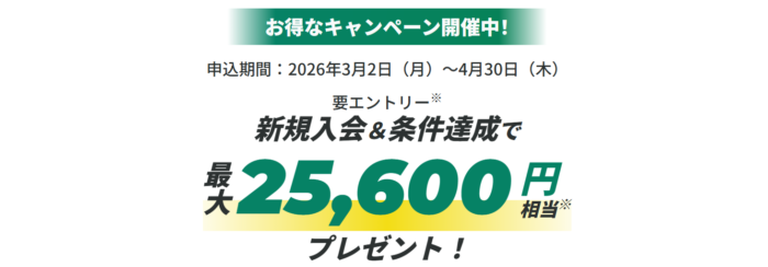 新規入会&条件達成でVポイントが最大25,600ポイントもらえます。
