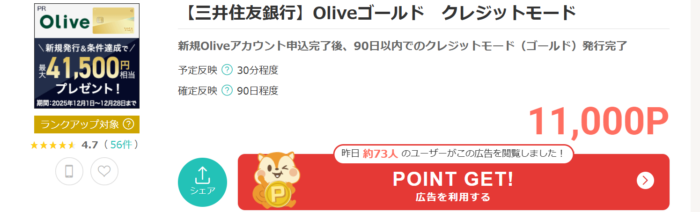 Oliveフレキシブルペイゴールドは現在、ポイントサイトへの掲載があります。