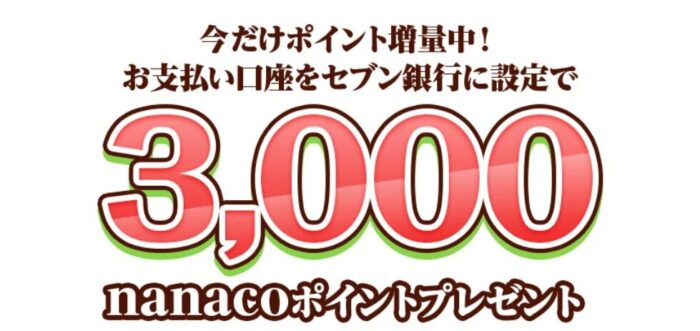 お支払い口座をセブン銀行に設定いただいた方に、さらにもれなく3,000nanacoポイントをプレゼントされます!