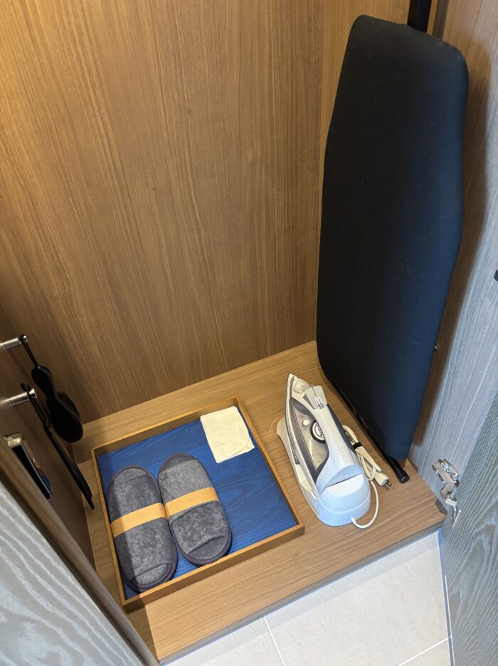 クローゼットには、金庫、ナイトウェア、スリッパ、靴べら、ダスト袋、アイロン台、ブラシがありました。