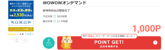 WOWOWオンデマンドは現在、ポイントサイトへの掲載があります。